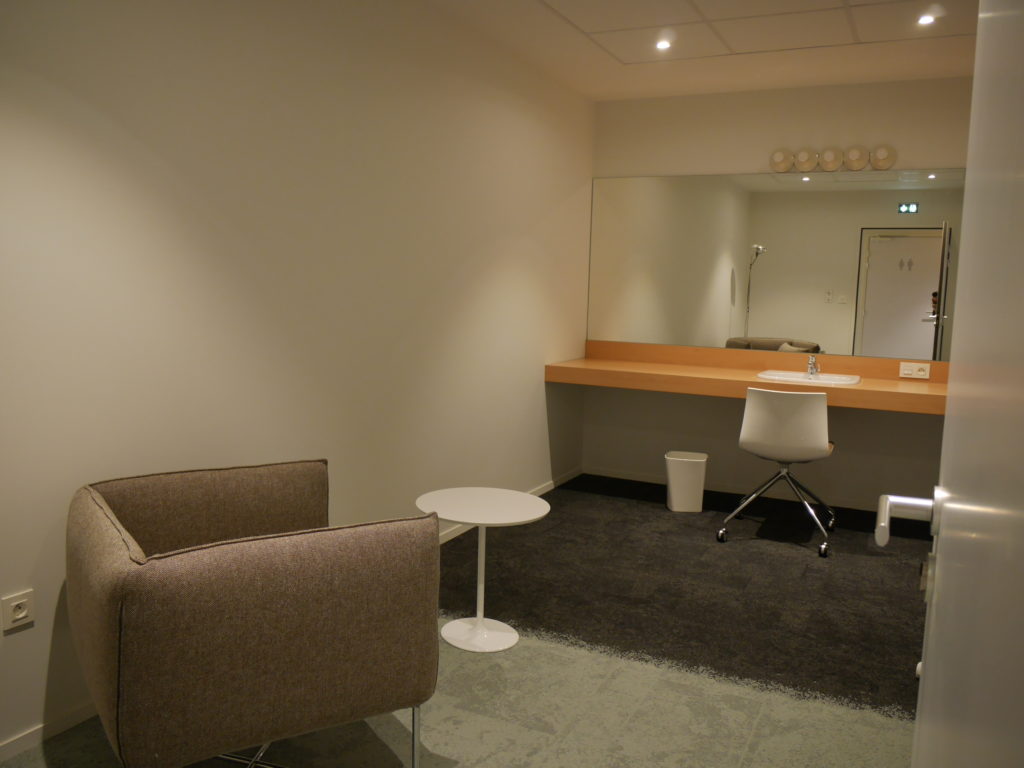 Loges : 1 loge collective (douche et sanitaire homme et femme) et 6 loges individuelles dont 2 avec douche et sanitaires. Toutes sont pourvues de retour plateau.