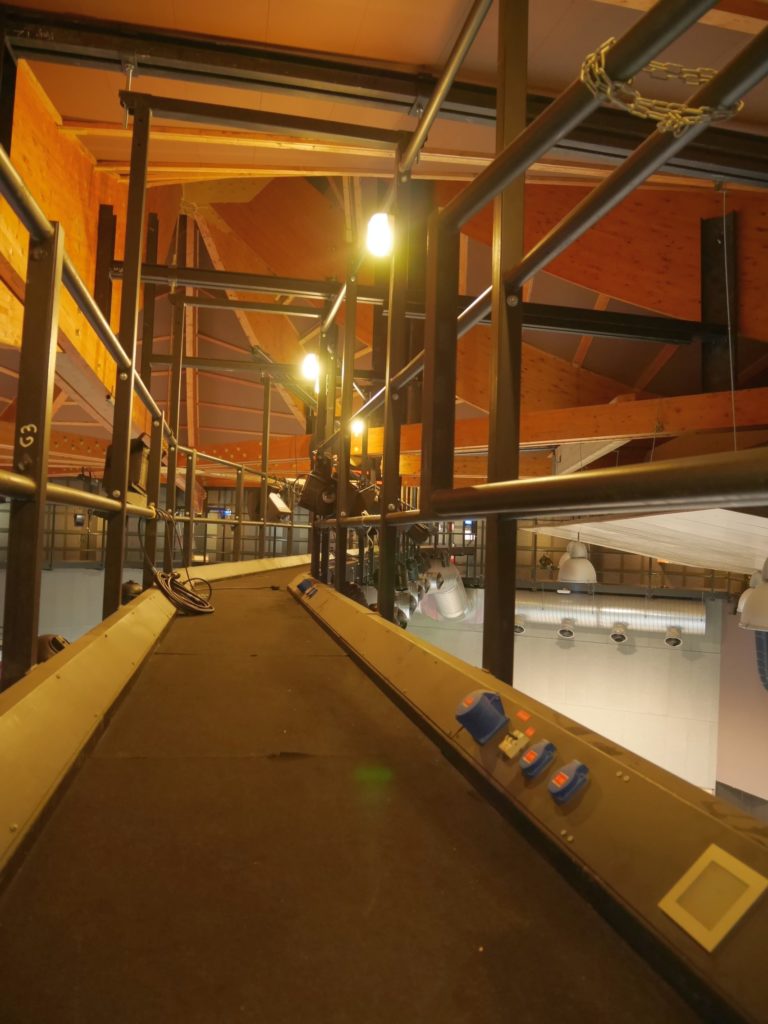 Salle : Passerelle de face à 10,5m du nez de scène équipée de 2 lisses d'accroche (9,20m et 9,70m); Passerelle périphérique.