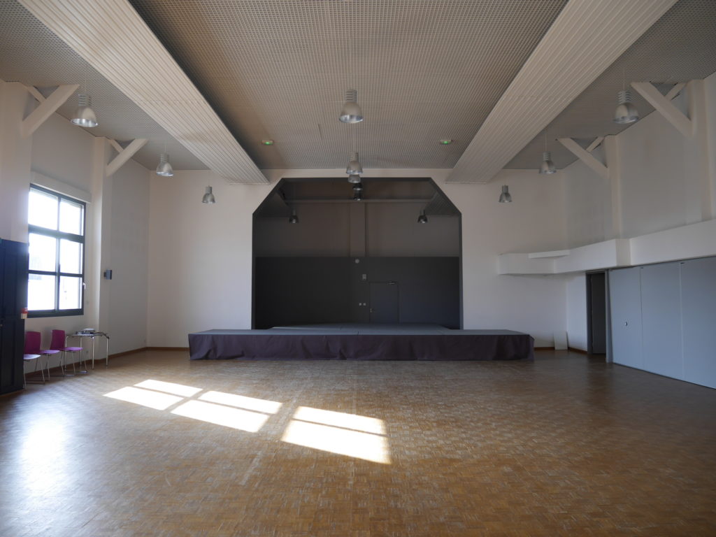 Avec praticables : plateau de 5m d'ouverture x 4m de profondeur, plus proscenium de 8m x 2m
