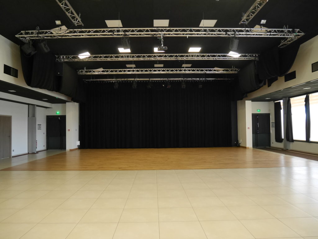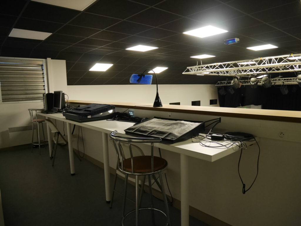 Salle : 2 ponts triangulés fixes à 2.15 et 5.15 du bord de scène et 4,95m de hauteur