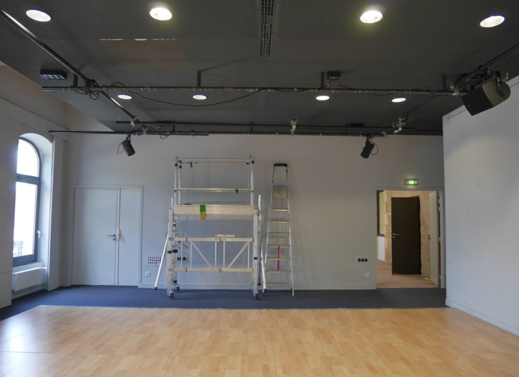 Courant fort : 1 P17 63A et 4 P17 32A armoire fond de salle, prises 16A en salle et au niveau des porteuses. 125A total en tête.