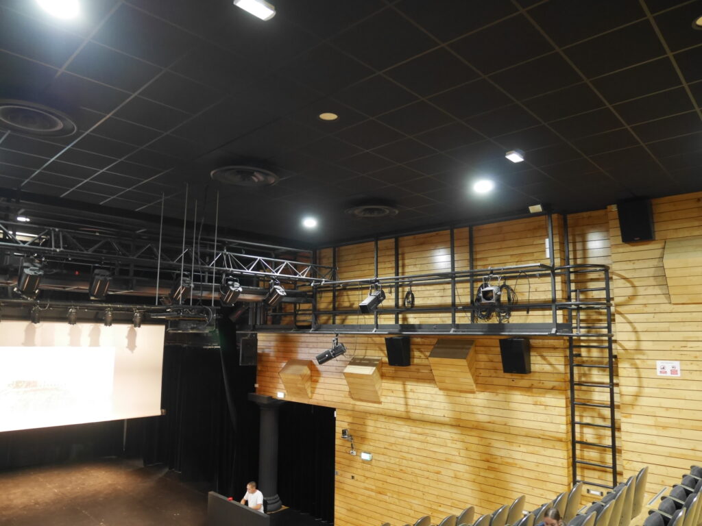 Salle : 1 passerelle de face et les passerelles latérales jardin et cour se prolongent jusqu'au mileu de la salle. 1 porteuse fixe (poutre triangulée)