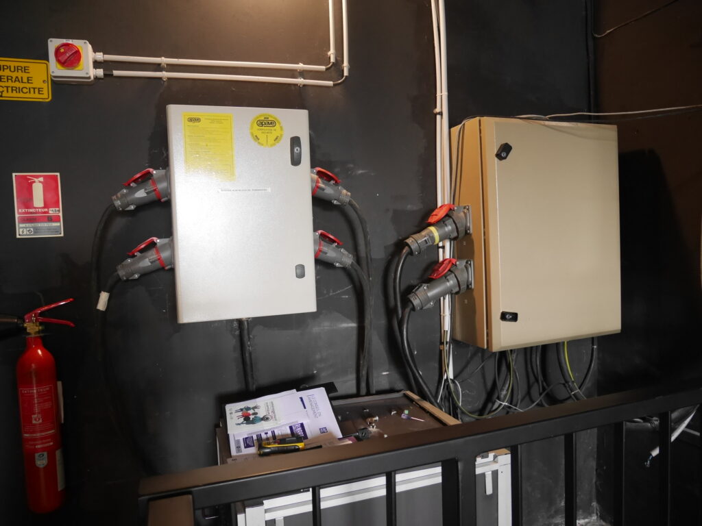 Courant fort : 2 P17 63A et 4 x P17 32A au niveau passerelle; 100A au total. Lignes graduées réparties à 6 endroits (10A par canaux)