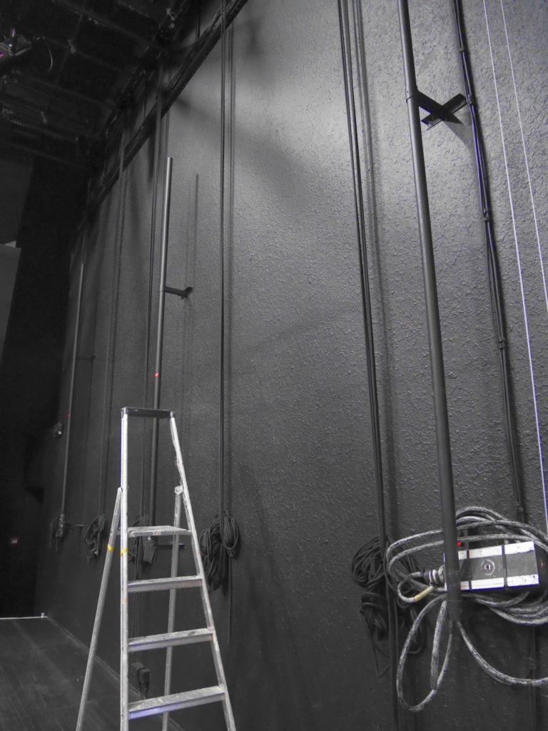 Mur du fond composé de panneaux en bois noir, surplomb de 3m à 4,50m du sol (voir plan). Hauteur de 3,68m sous les perches manuelles dédiées à la draperie.