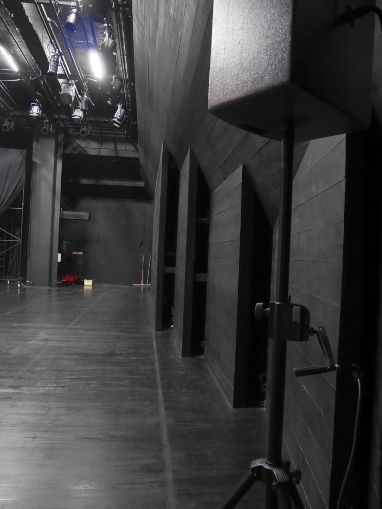 Régie : Fond de salle, ouverture sans fenêtre. Installation dans les gradins à voir avec l'équipe technique